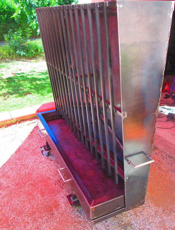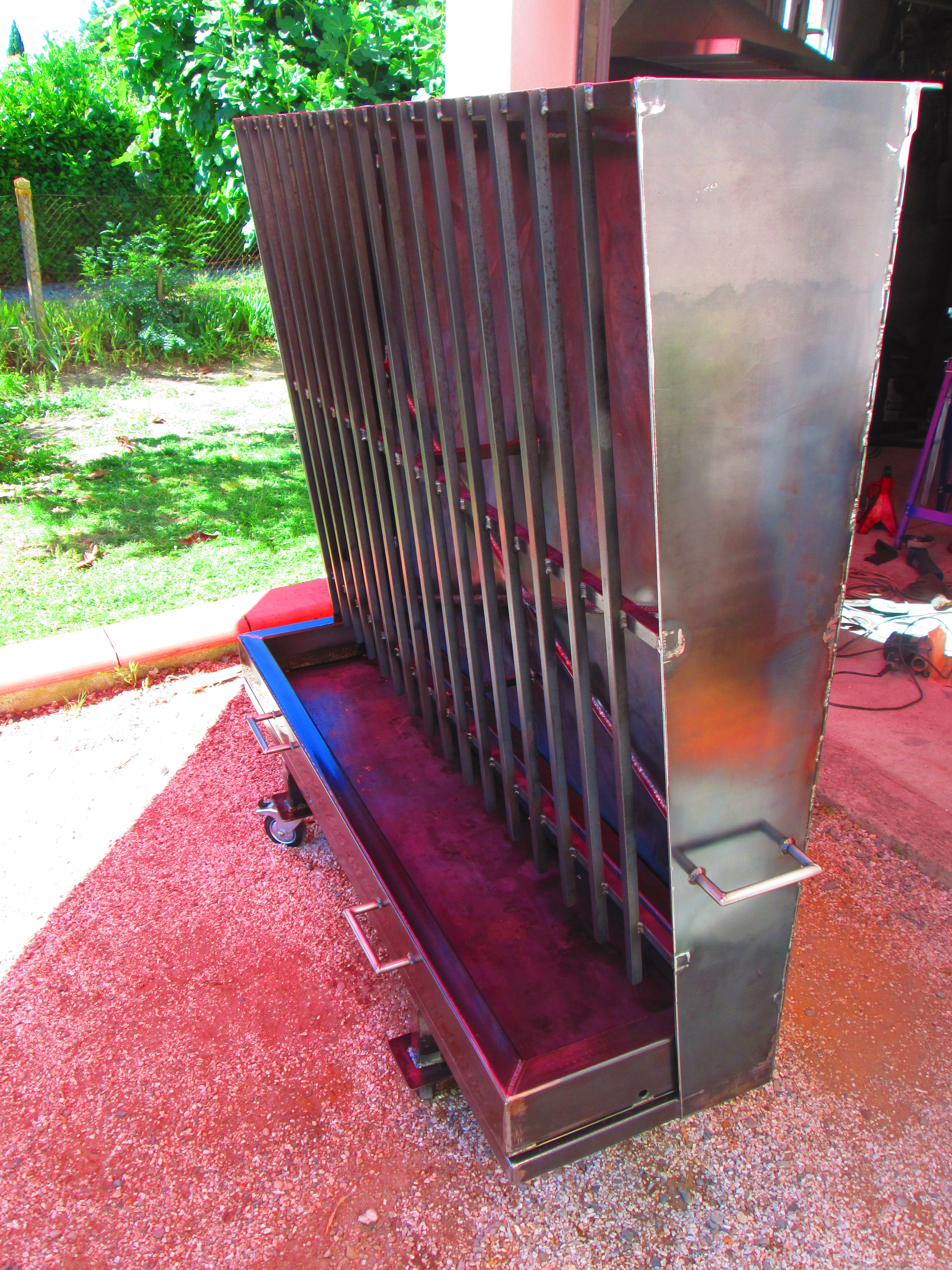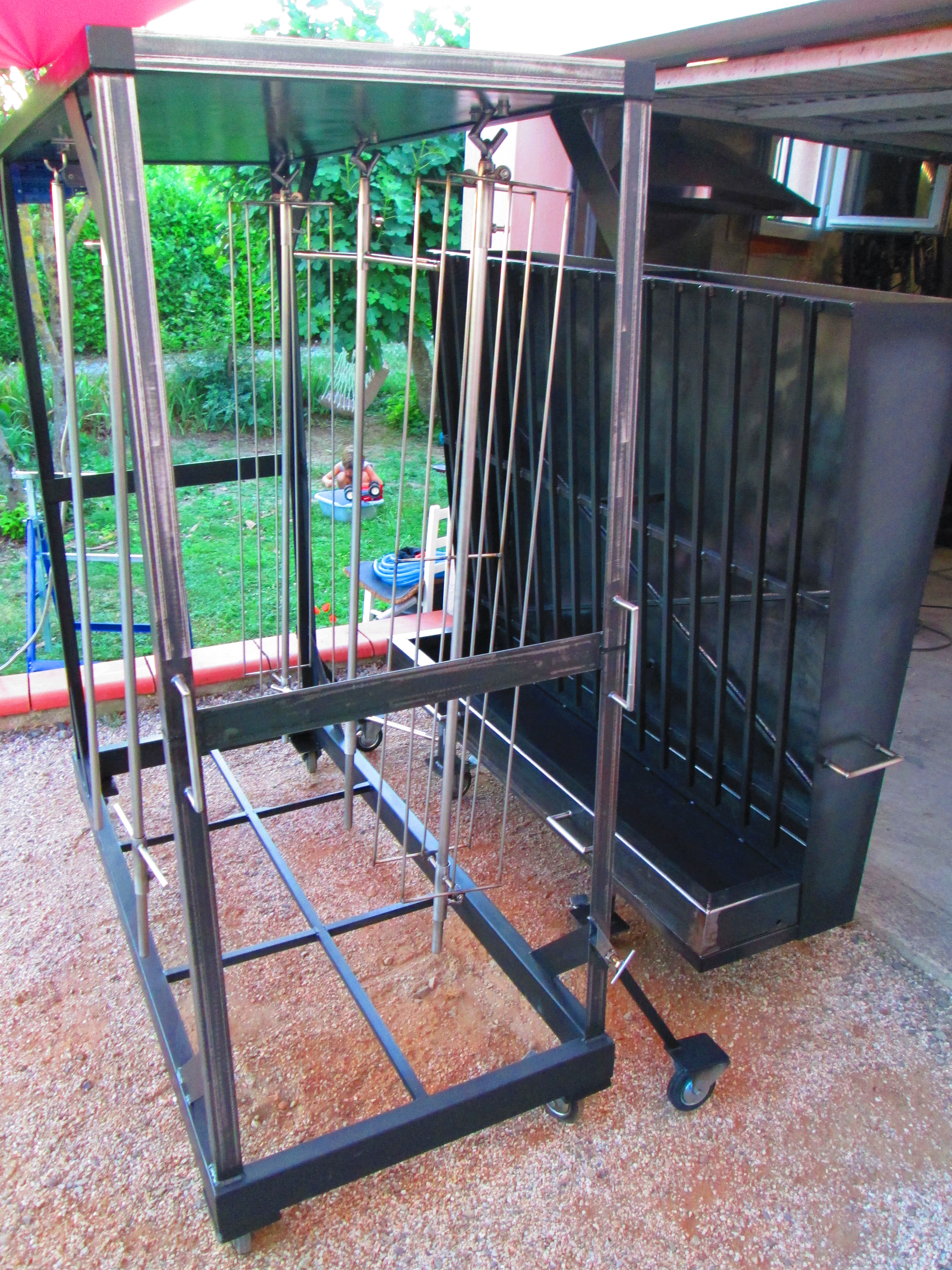 Foyer vertical avec 3 broches verticales motorisées à 4 tours par minute d’une capacité de 240 Kg, répartie sur 5 broches, environ 144 Kg en façade de cuisson, création et modèle réalisé par « STANISTEEL ».