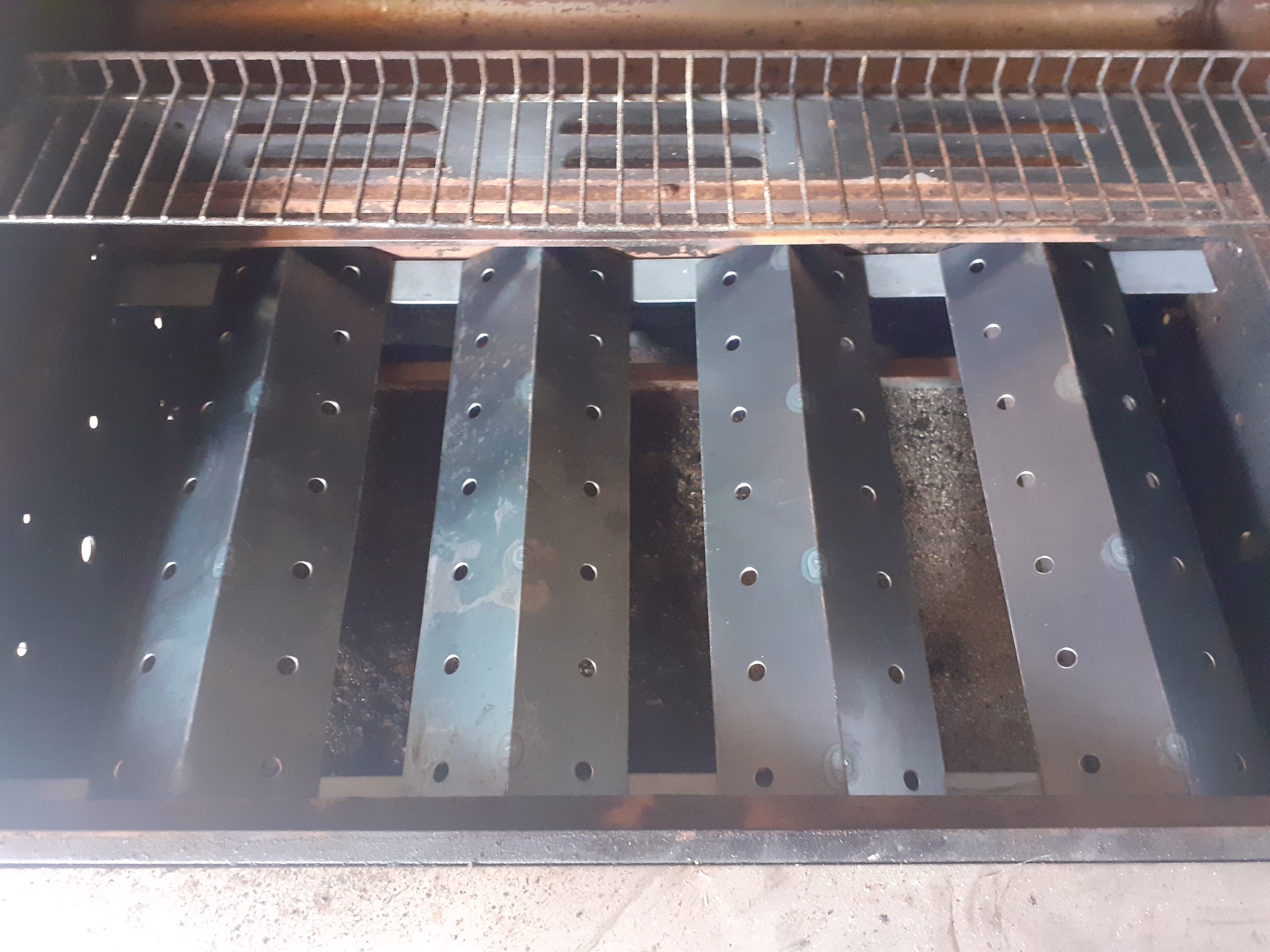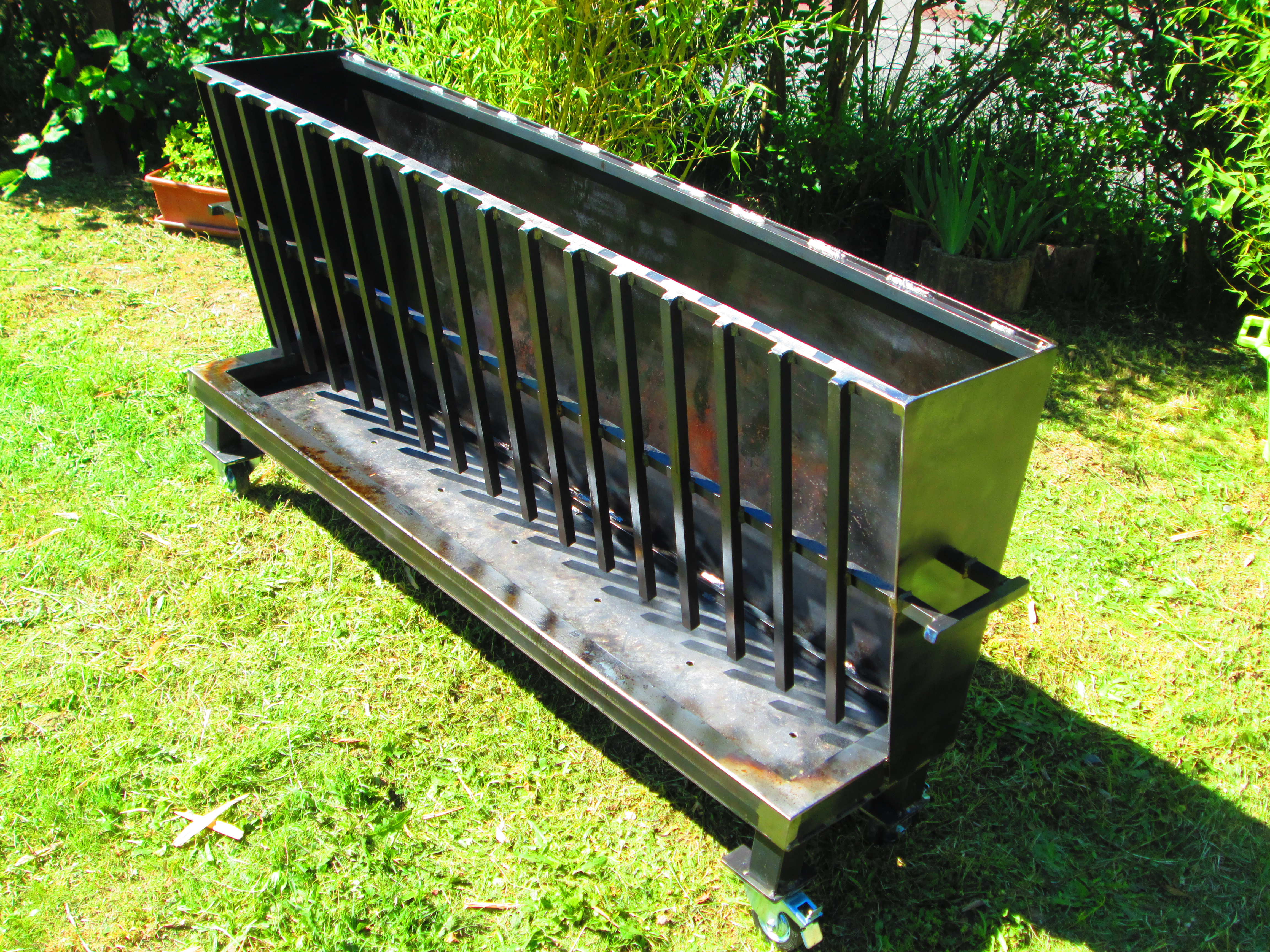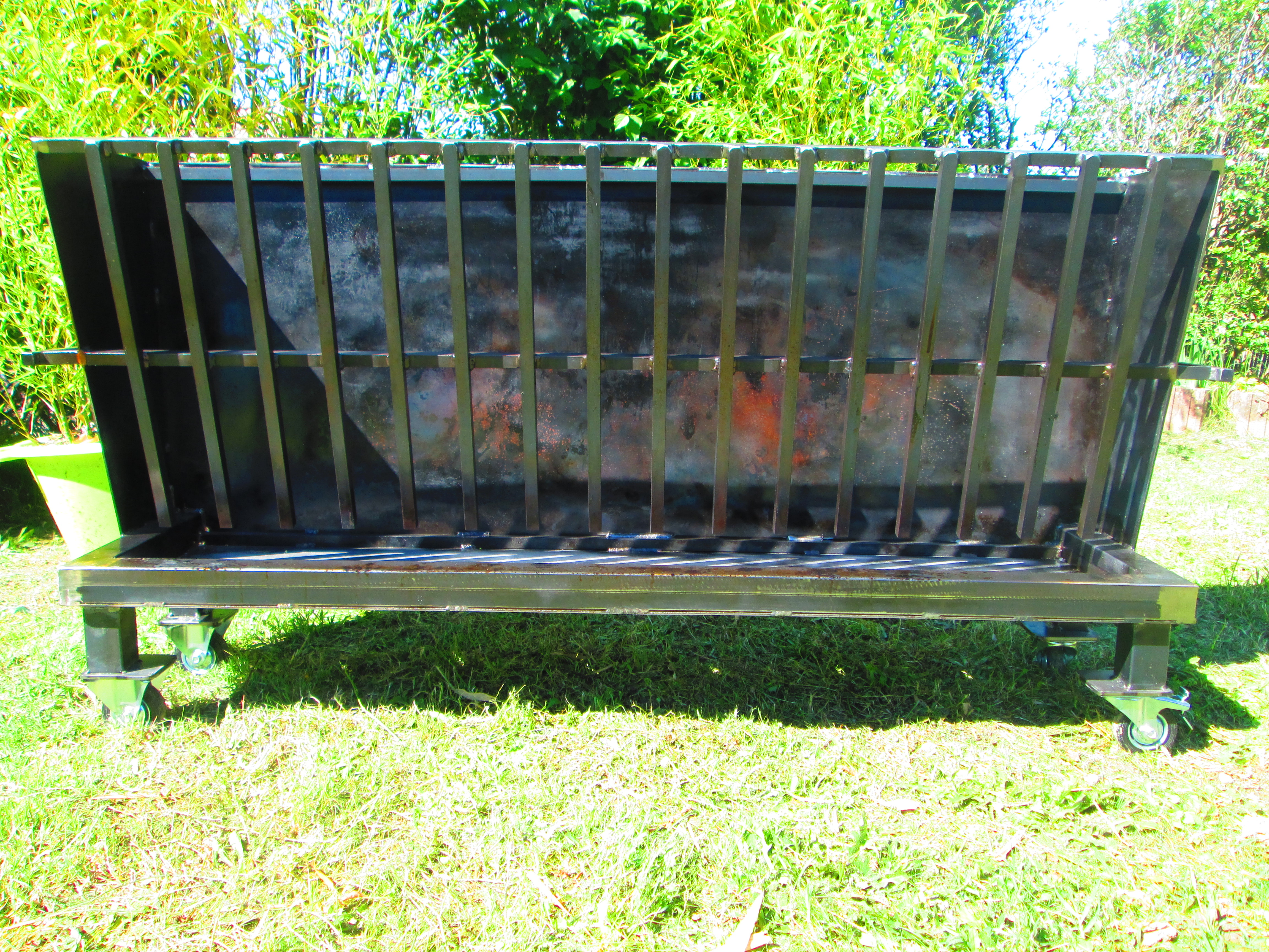 Foyer vertical avec 3 broches verticales motorisées à 4 tours par minute d’une capacité de 240 Kg, répartie sur 5 broches, environ 144 Kg en façade de cuisson, création et modèle réalisé par « STANISTEEL ».